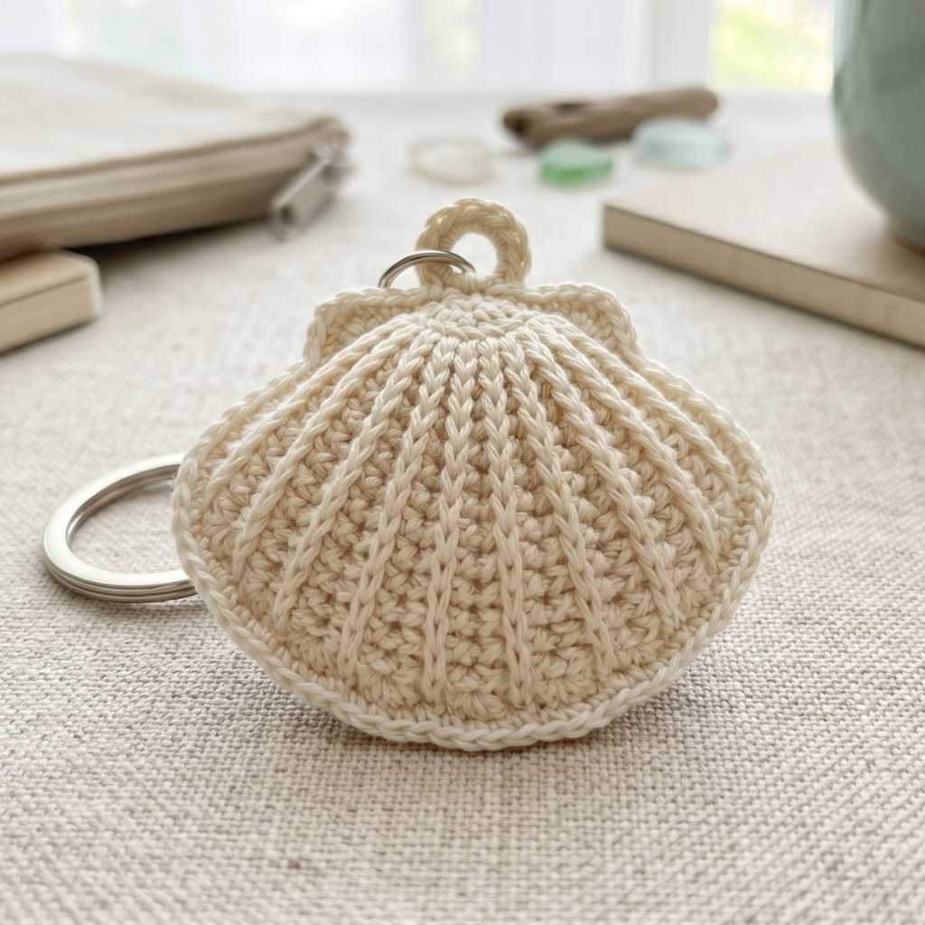 Begin with a small magic ring or narrow foundation and build the shape outward. The shell can be made as a fan, curved appliqué, or small structured motif depending on the style you prefer. Keep the design compact because the keychain should stay light.