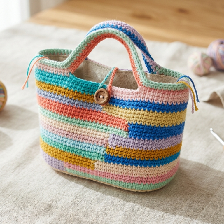 This is the perfect place to mix yarn leftovers. Use each scrap for a different row or section, creating a colorful recycled yarn look. Keep the transitions neat so the bag looks intentional rather than random.