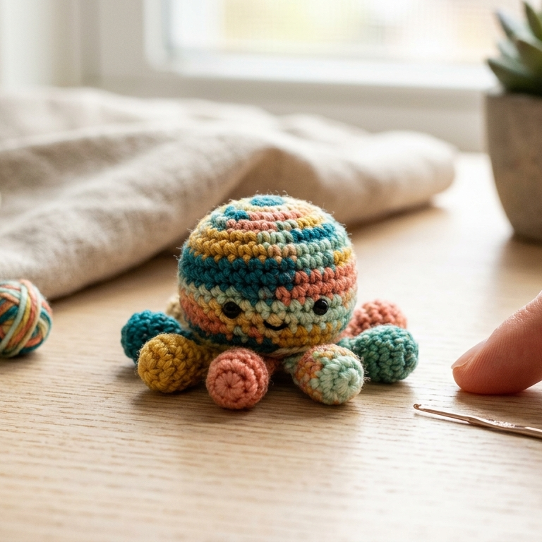 The tiny scrap yarn roundish octopus is a playful little amigurumi project that is perfect for using tiny leftover yarn pieces. Because the body is small and the tentacles are quick to make, this pattern works well when you want to use scraps that are too short for larger projects. It is cute, fun, and ideal as a desk buddy, keychain, gift topper, or decorative toy.