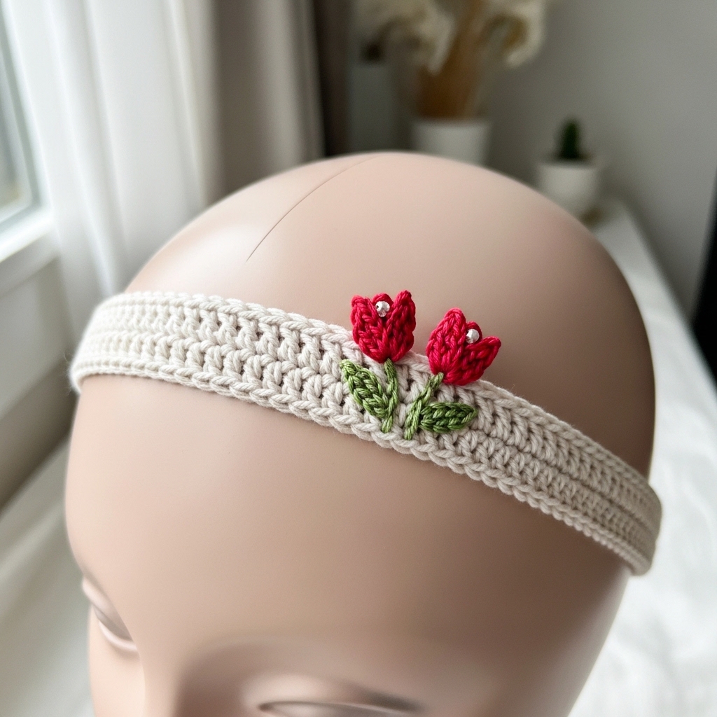 Vibe: Bold and romantic — a narrow headband with two embroidered/crocheted tulip motifs at one side.