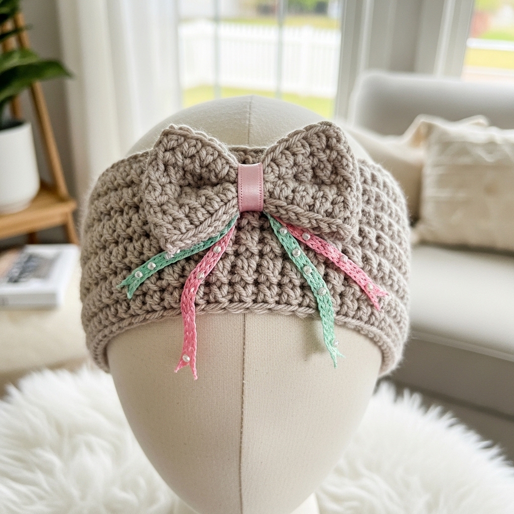 Vibe: Sweet and charming — a broad headband with an embroidered ribbon motif and central crocheted bow.