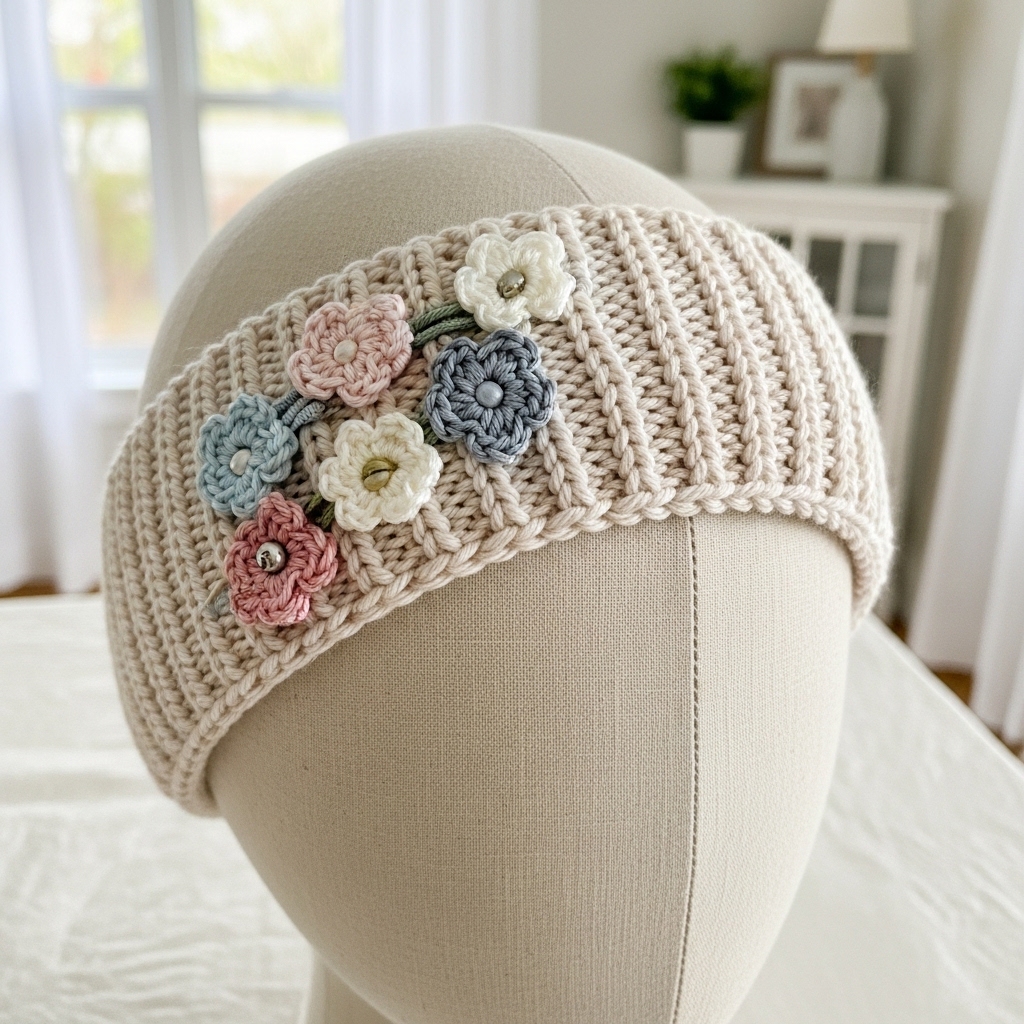 Vibe: Soft, everyday femininity — an easy, knitted-look headband with small crochet flowers appliquéd on top.
