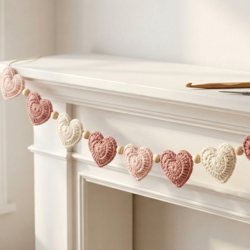 - Weave tails to back, tidy edges. Make 15 hearts per 6-ft garland (use spacing math above).