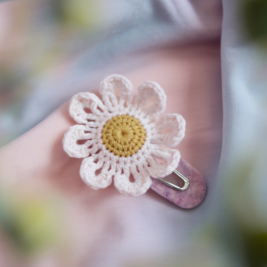 Materials: small amount DK or fingering cotton in white (petals) & yellow (center), 3.5 mm hook, 4–6 cm alligator or snap clip, tapestry needle, small dab of glue (optional).