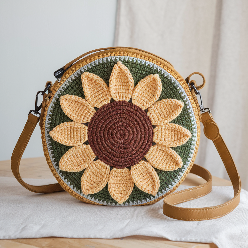 A cheerful crossbody featuring a large sunflower motif — bold center disk and layered petals — mounted on a compact round or rectangular bag. Great for festivals, markets, or adding a pop of color.