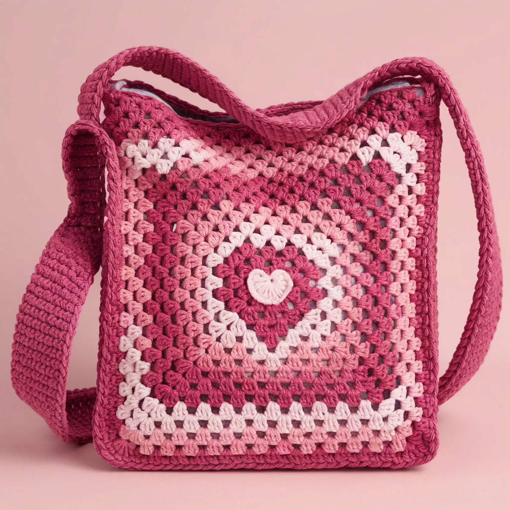 A playful granny-square bag with heart-motif centers — the iconic granny square updated with heart centers and modern colorblocking. Works as a roomy tote or crossbody when lined and reinforced.