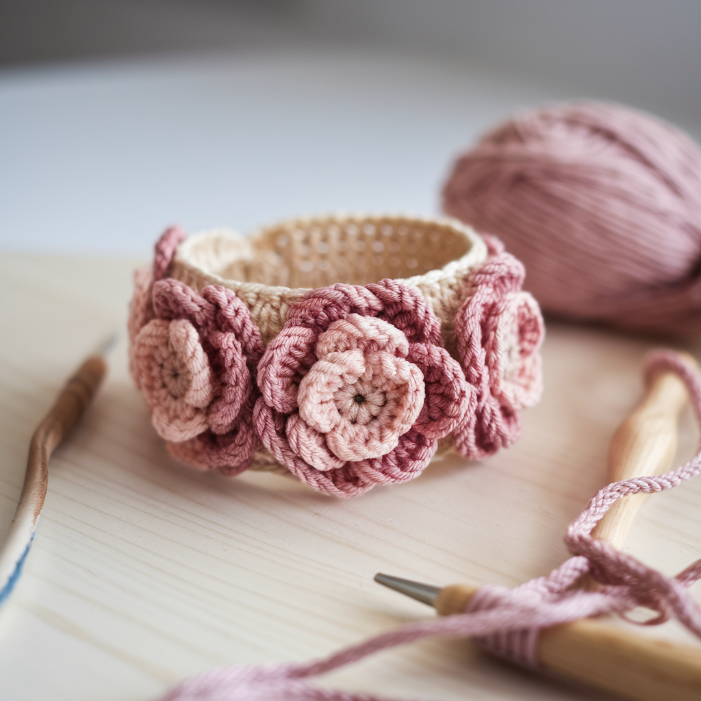 This bracelet uses a base of sc rows, then a round of petal clusters that flare out; petals are sculpted with short post-stitches for height. Work a band and either make petals on-top (sewn) or integrate by working petals across the band edge.