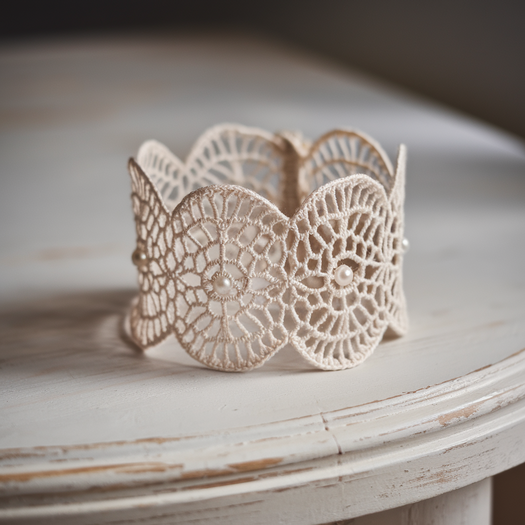 A narrow strip of lace built from V-stitches, shells and picots; worked flat, blocked to set the lace, and seamed with elegant closure. If you want a more fitted cuff, add a lining strip of soft fabric glued/sewn inside.