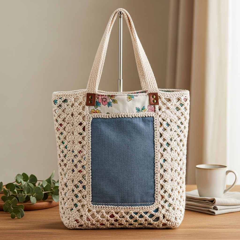 An upcycled tote that mixes crocheted panels with sewn-in repurposed cloth (e.g., vintage tablecloths or denim). Boho-luxe and sustainable.