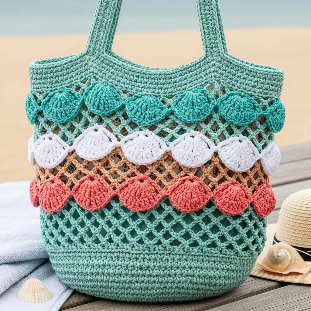 - Solid base, then alternate bands of shell stitch (decorative) and mesh (functional) to create a collectible seaside aesthetic.