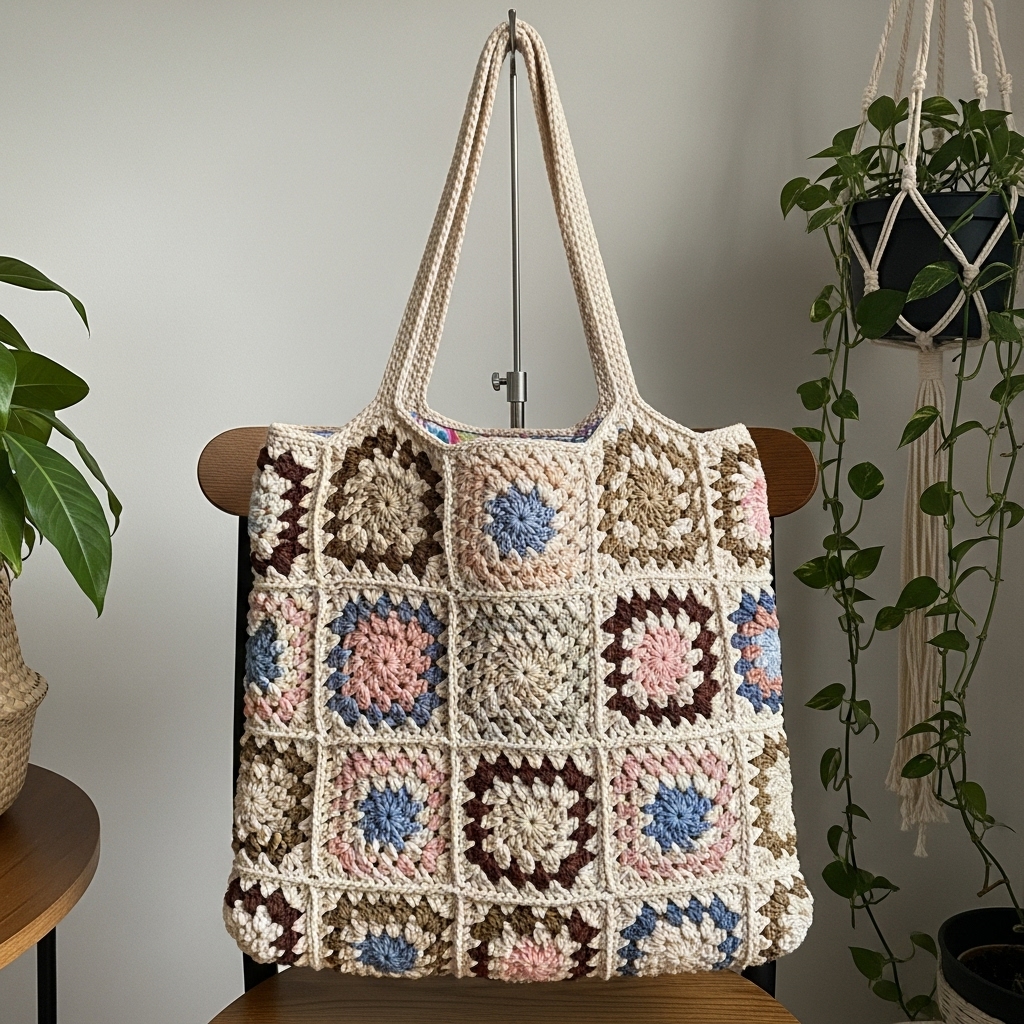 - Make 12–16 square motifs (e.g., 4×4 grid) sized to tessellate into the front and back panels. Join motifs with whipstitch or join-as-you-go, seam side panels and base, then add reinforced handles.