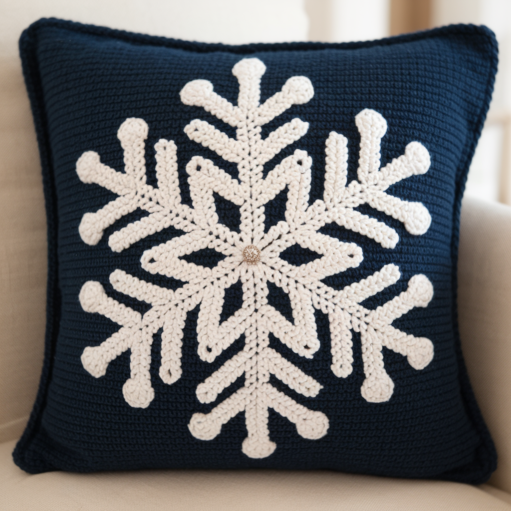 Overview: A seasonal 16″ square pillow featuring a raised snowflake motif in the center built with post stitches and layered applique. Festive but refined — works year after year.