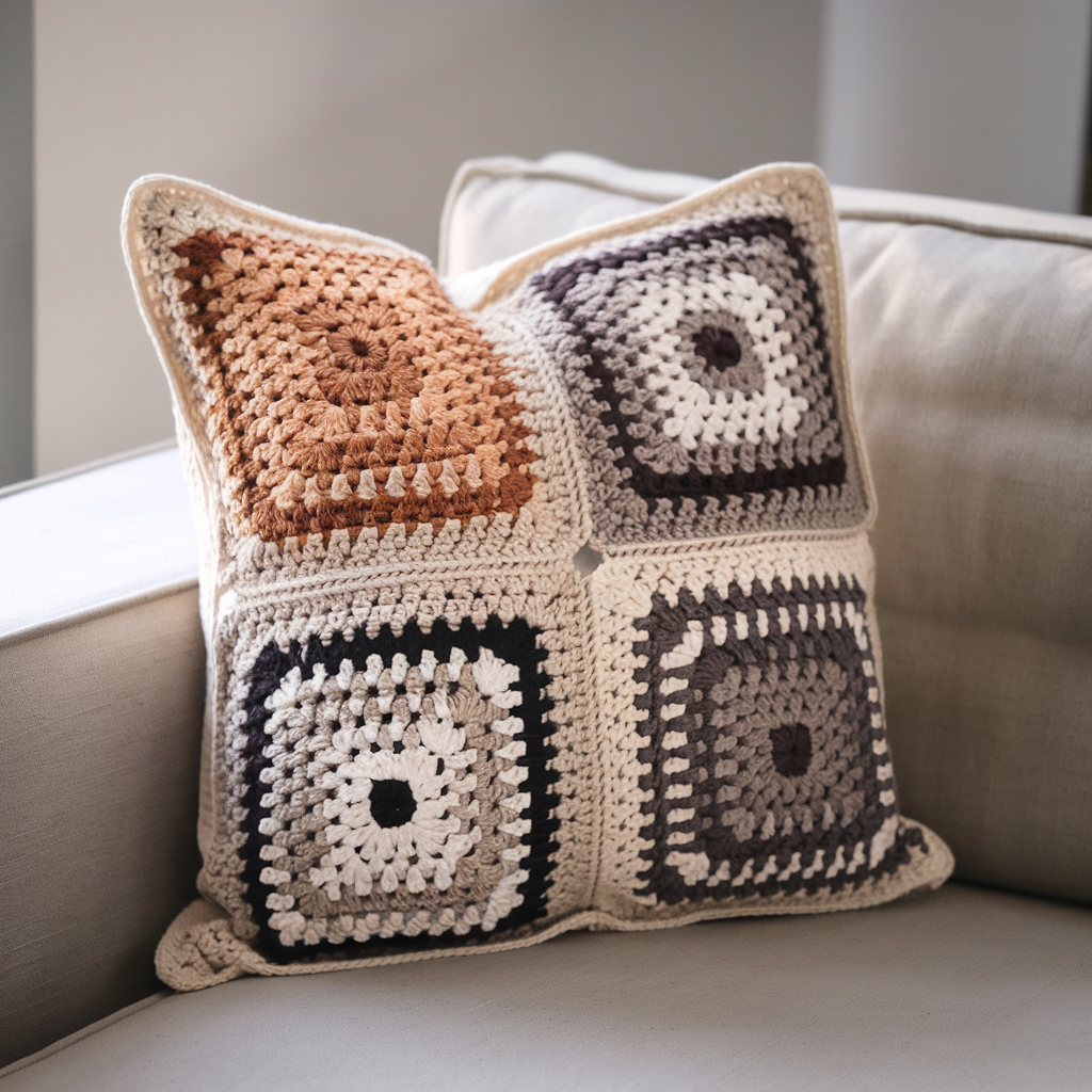 Overview: A modern twist on the classic granny motif — diamond-shaped granny squares joined to make a bold cushion cover. Perfect for color play and textures.