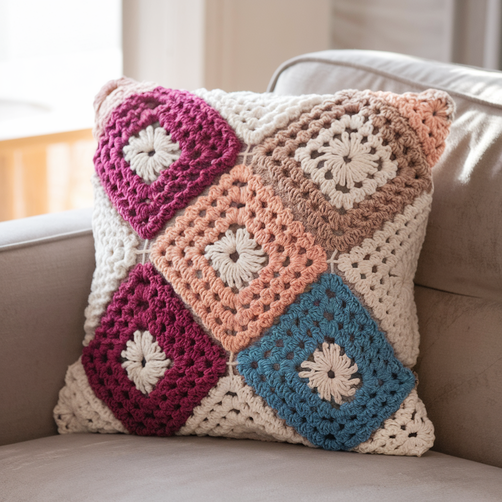 Finished size: 20″ × 20″ pillow (4 large granny squares, each ~10″).