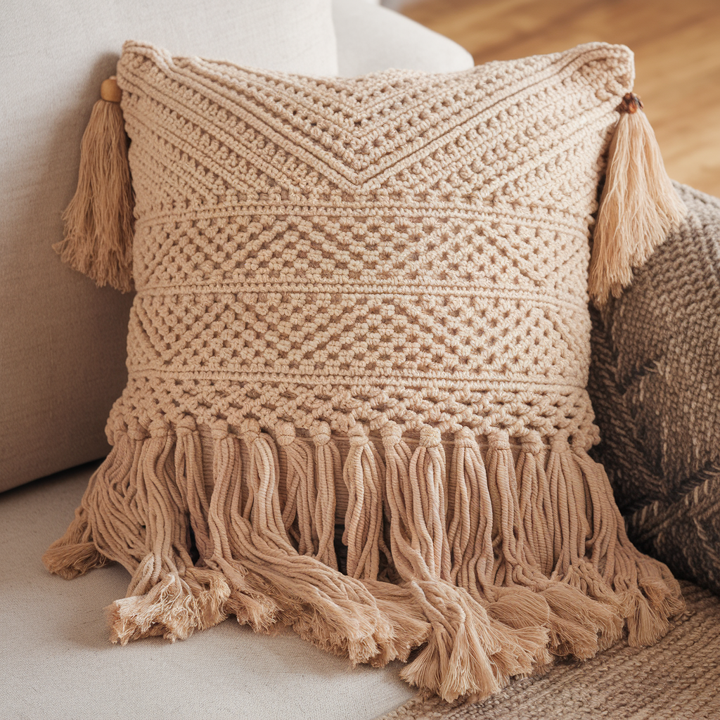 Overview: A cozy 18″ square pillow cover with boho texture—macramé-inspired fringe, openwork panels, and a central textured motif. Statement piece for sofas and floor seating.
