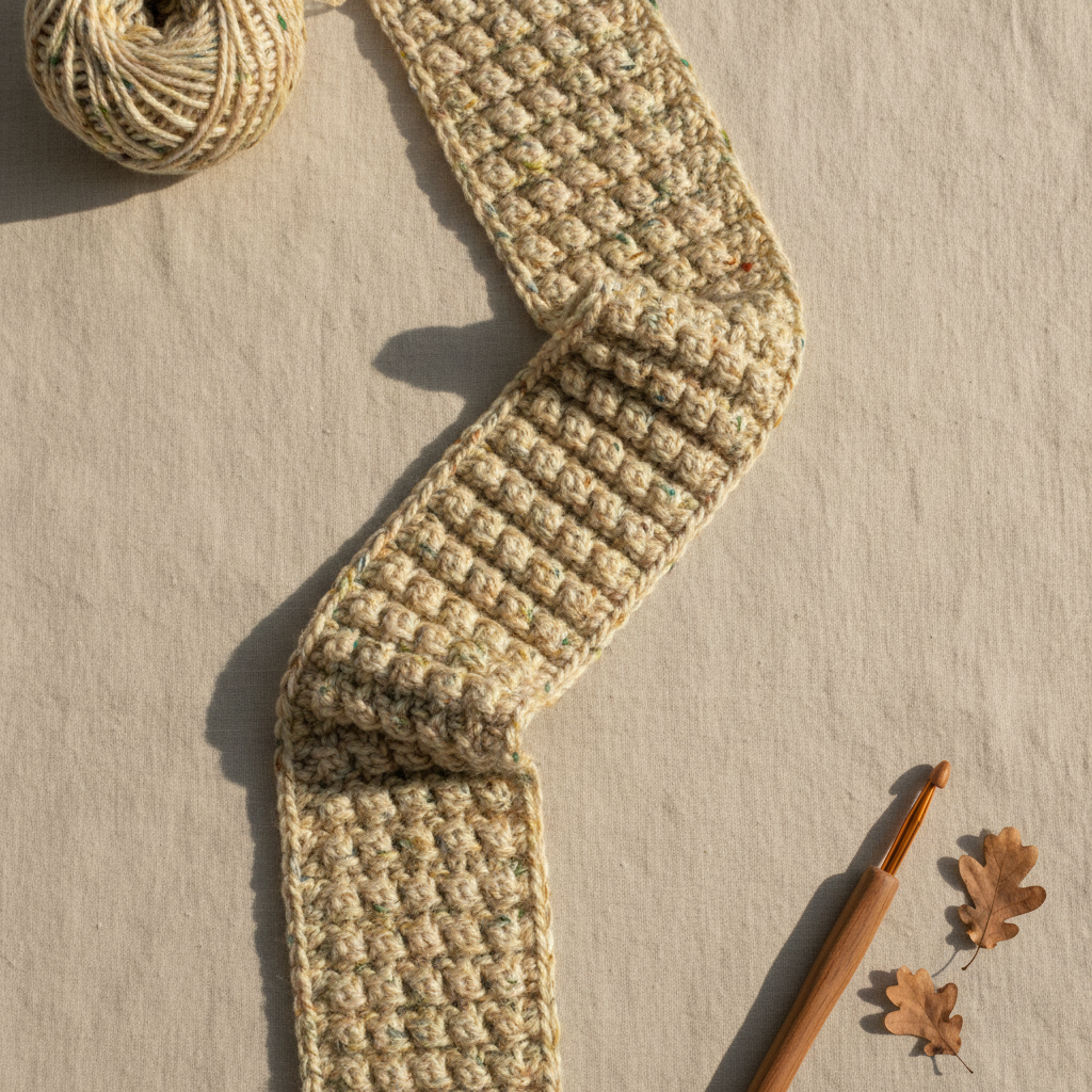 A tactile, cozy scarf using puff stitches (or bobbles) that create a nubby, tweedy texture — excellent with tweed or slubby yarns. This one is warm and textural, perfect for cold-weather styling.