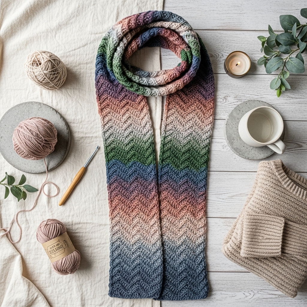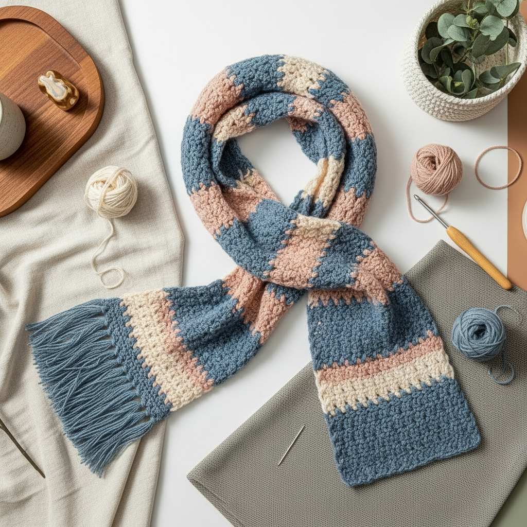 Fresh, wearable, and endlessly customizable — scarves are one of the best crochet projects: portable, quick to finish, and ideal for showing off a stitch texture or special yarn. This collection gives you five modern scarf patterns that suit a variety of skills and styles: from the calm minimalism of the Serenity Scarf to the playful texture of the Tweedy Puff Stitch Scarf, plus fringe, chevron, and striped options. Each pattern below includes a clear overview, skill level, recommended materials, gauge and finished-size guidance, a step-by-step construction (with stitch repeats and sample counts), variations, finishing & blocking tips, care instructions, and styling ideas.