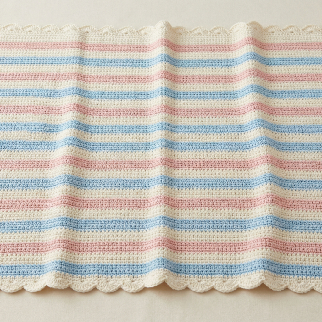 This pattern is especially lovely in pastel stripes or soft tonal lines. If you want a more classic look, use cream and pale blue or blush and ivory. The scallops add a sweet finishing touch that makes the blanket feel special enough for a keepsake.