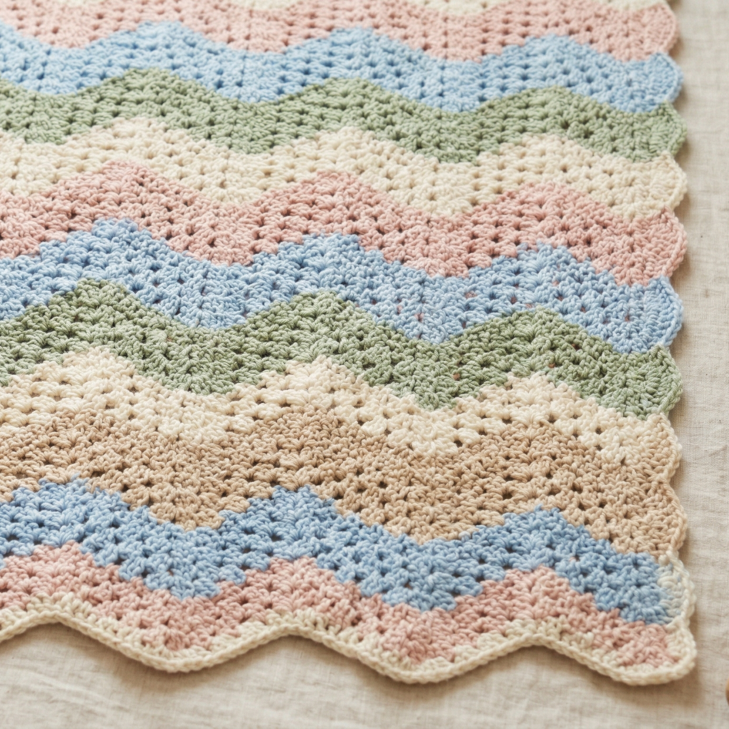 Once the ripple base is in place, build the blanket with granny-style cluster sections or small shell-like groupings. This adds a soft classic texture to the waves and makes the blanket feel warm and visually interesting. Keep the clusters balanced so the design remains smooth.