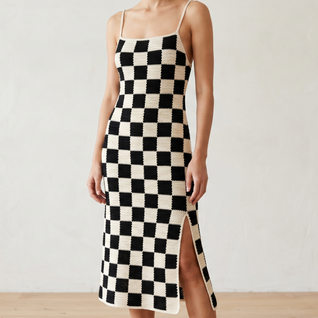 This dress looks especially chic in black and cream or muted neutral tones. If you want a more playful version, try soft pastels or retro-inspired colors. Keep the checkered layout neat so the dress looks boutique-made rather than overly busy.