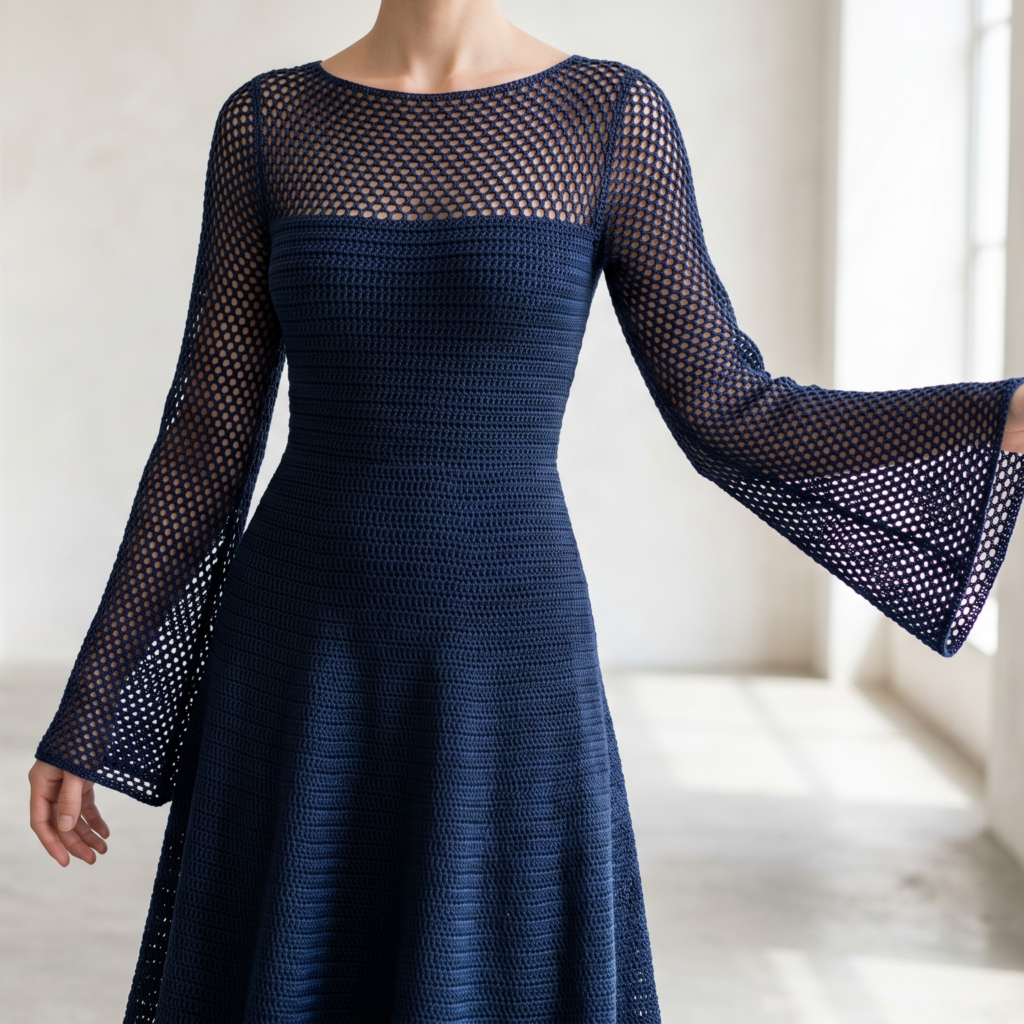 Before you begin, take bust, waist, hip, sleeve, and dress-length measurements. This style works best when it gently follows the body without feeling too tight. A flattering fit is especially important for a dress with mesh details, because the openwork will naturally draw attention.