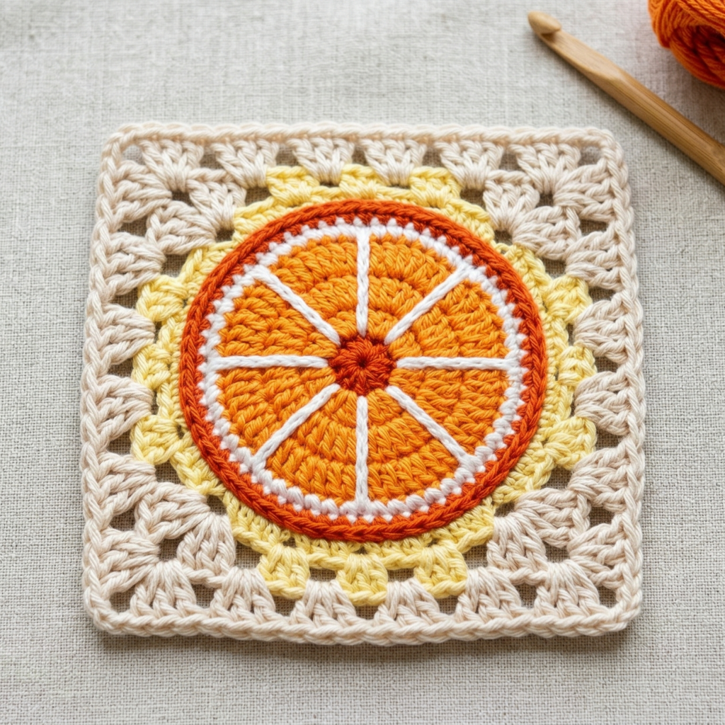 Once the citrus slice is complete, begin working corner spaces around it to form the granny square. Use chain corners and cluster rounds to expand the shape outward. The square should frame the citrus motif without covering too much of it.
