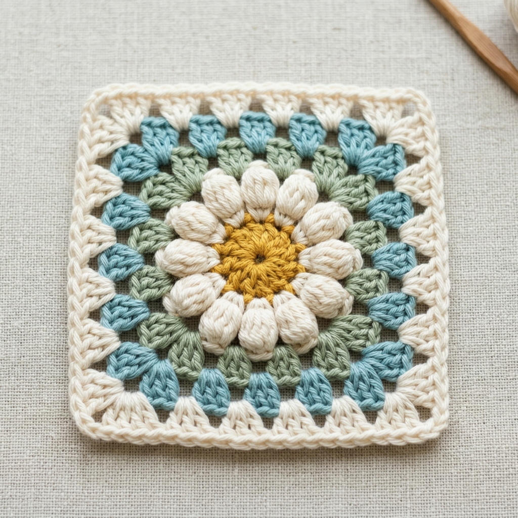 Once the square reaches your desired size, add a final round of single crochet or granny clusters to clean up the edges. This border helps frame the flower and makes the square look complete. If you are making several squares for a larger project, this is also a good point to make sure they all match in size.