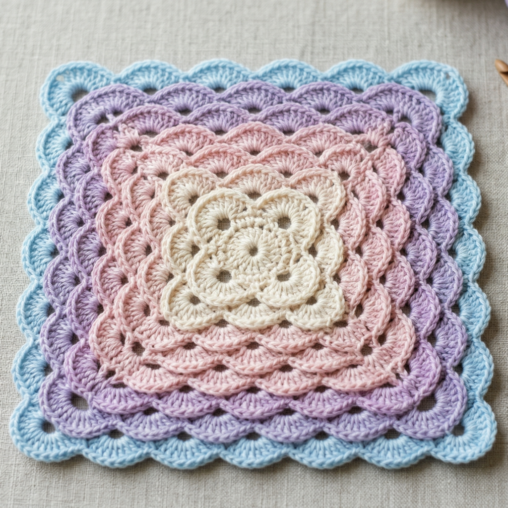 Work the scalloped border all the way around the square, checking that the pattern stays even. The scallops should feel decorative but not so large that they distort the square. A balanced border adds charm without taking away from the shape.