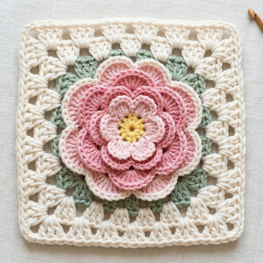 A camellia flower granny square feels elegant, delicate, and a little more refined than a simple floral square. The camellia motif is made of layered petals that create a rich, blooming center. This pattern is perfect if you want a square that looks special enough for a keepsake blanket, decorative pillow, or high-end handmade bag.