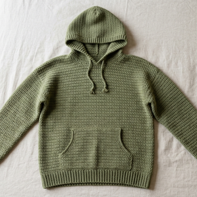 Add ribbing around the cuffs, hem, and hood edge if desired. You can also add a drawstring for a more classic hoodie look. Weave in all ends carefully and block lightly if needed so the stitches settle nicely.