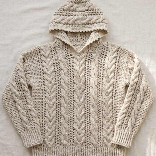 This hoodie looks beautiful in cream, oatmeal, soft gray, or muted jewel tones. If you want a more luxurious feel, choose a yarn with excellent stitch definition. Open cable designs are especially pretty for transitional weather and layered outfits.
