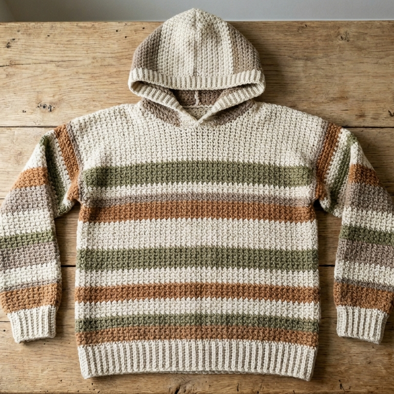 A hoodie with waffle texture looks great with a simple hood. Crochet the hood deep enough to sit comfortably and make sure it does not pull the neckline. If you want extra detail, add a striped edge to match the body.