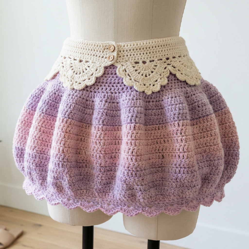 To create the puffy effect, add increases or use a stitch pattern that naturally expands. Shell stitches, clustered stitches, or frequent increases can all create volume. The skirt should feel rounded and airy without becoming too heavy.
