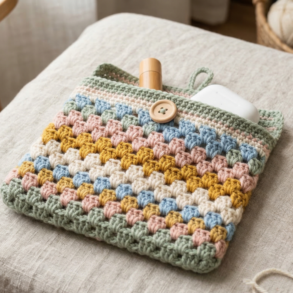 A granny stitch pouch is a practical scrap yarn project that can hold makeup, earbuds, stationery, or small crochet tools. It looks cheerful with striped rows and is easy to adapt.