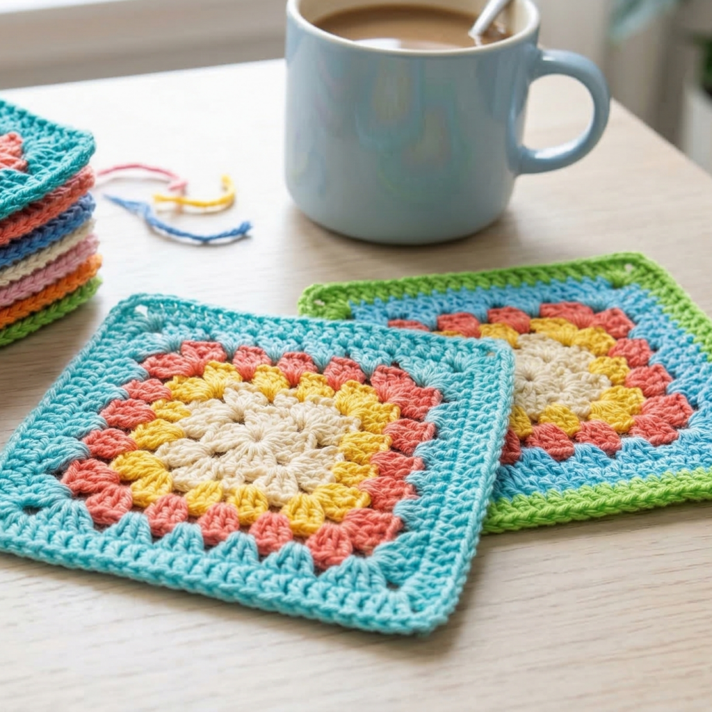 Granny square coasters are one of the easiest scrap yarn projects because they use very little yarn and let you mix colors freely. They also work up quickly, making them perfect for a set of four or six.