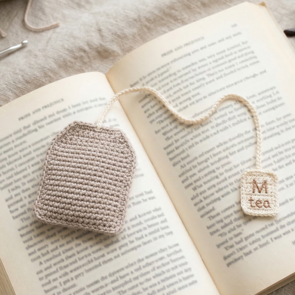 This adorable teabag-style bookmark is a creative and practical scrap yarn project. It looks like a tiny teabag hanging from your book, with a string and tag that stays outside the pages. It’s perfect for gifting, especially for tea lovers and readers.