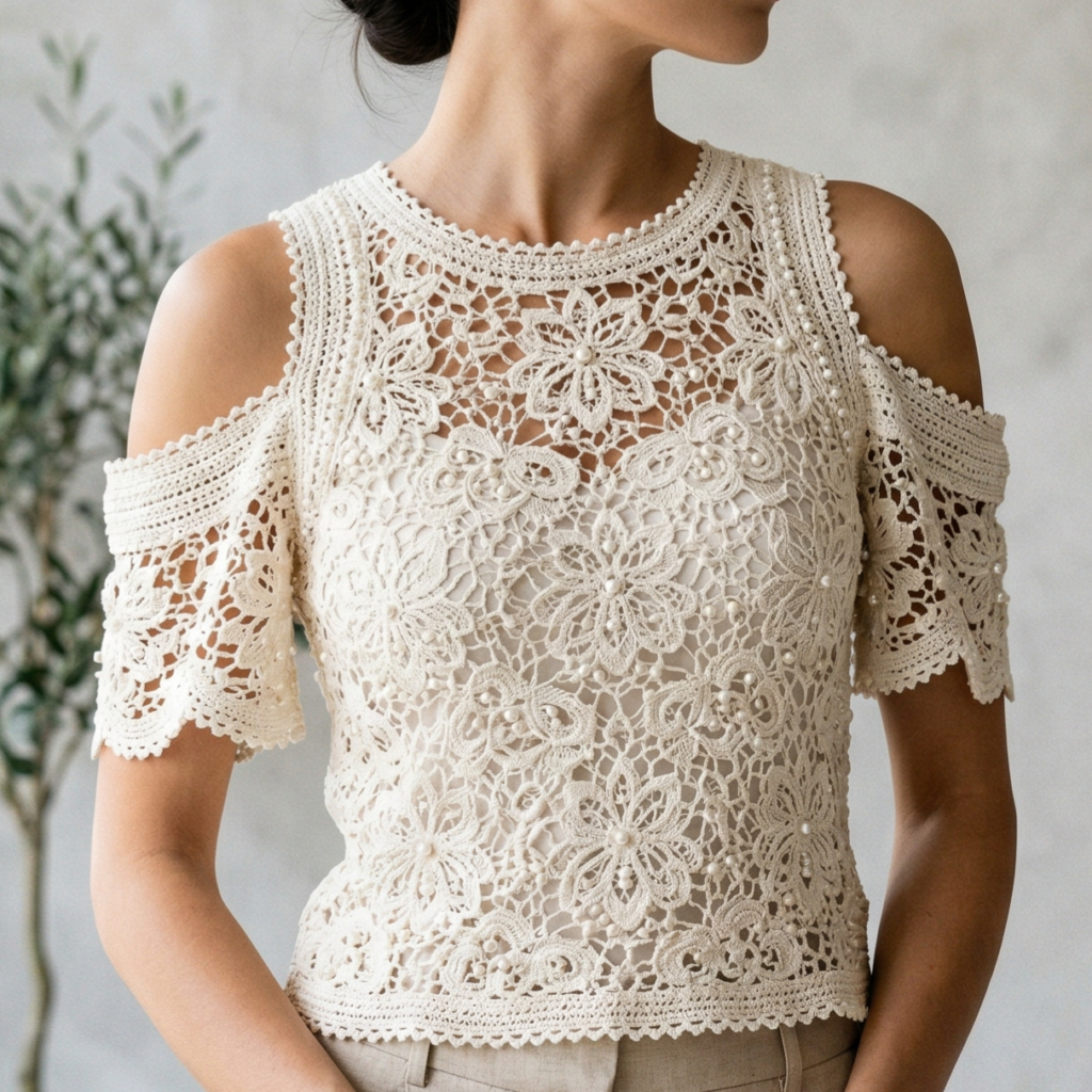 Use a neat border around the neckline, sleeves, and hem. A scalloped or picot edge can work beautifully here. Finish the top carefully so the lace pattern looks clean and the silhouette remains refined.