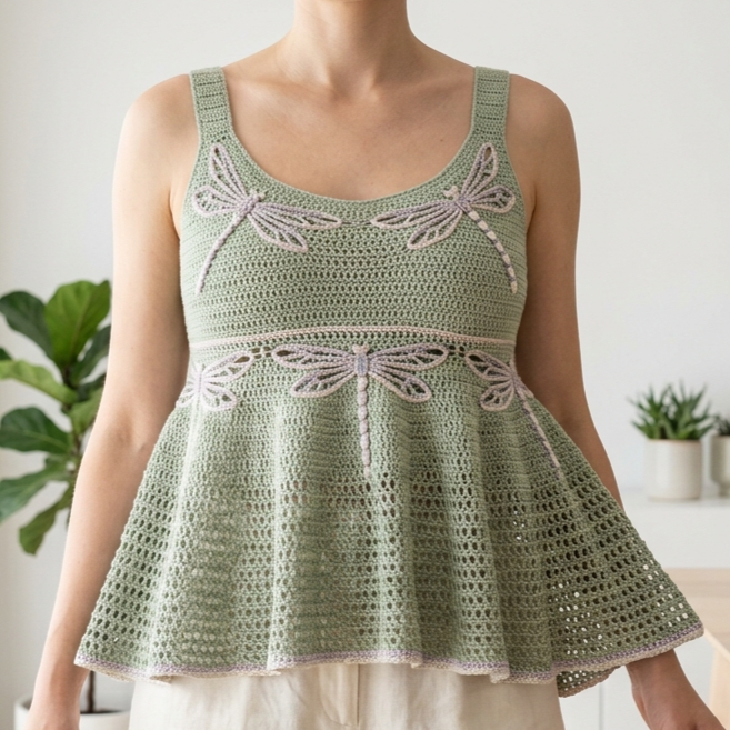 A dragonfly babydoll top is soft, airy, and full of whimsical charm. The babydoll shape gives it a relaxed silhouette, while dragonfly-inspired detailing adds a delicate, almost magical touch. This style is especially lovely for spring and summer, and it works beautifully in light yarns with graceful drape.