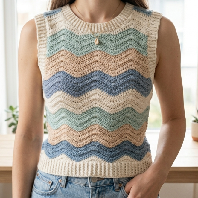 A wave top looks especially striking in solid or tonal yarn because the stitch texture gets to shine. If you want a beachy feel, choose blue, cream, or sand tones. If you want a trendy everyday top, try black, white, or earthy neutrals.