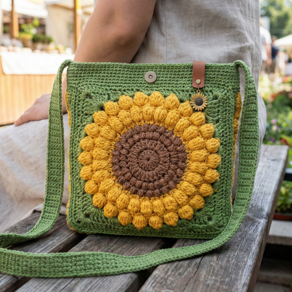 A bright, sunny crossbody built from granny squares — flattering for makers who love motifs and colorwork.