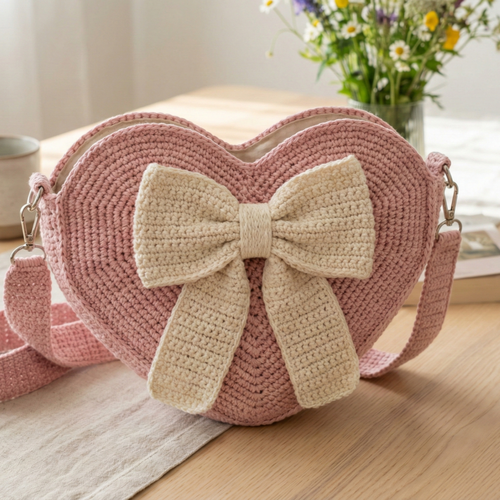 Make two identical heart-shaped panels (worked flat in rows or joined rounds with shaping), join them with a side gusset for depth, add big bow decoration and a sturdy strap.