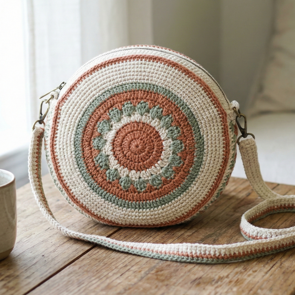 Yarn & tools: worsted or DK cotton for sturdiness, 5.0 mm hook for a tight but smooth circle, zipper closure, lining fabric, strap hardware optional.