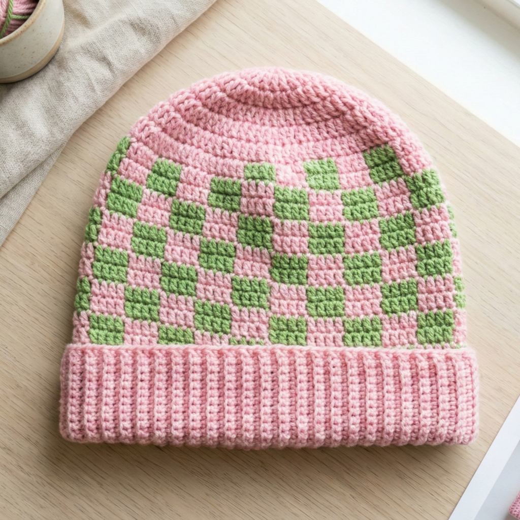 1. Crochet Pink & Green Checkered Beanie Pattern