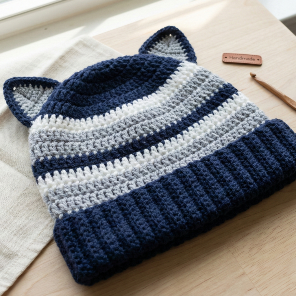 5. Crochet Cat-Ear Striped Beanie Pattern
