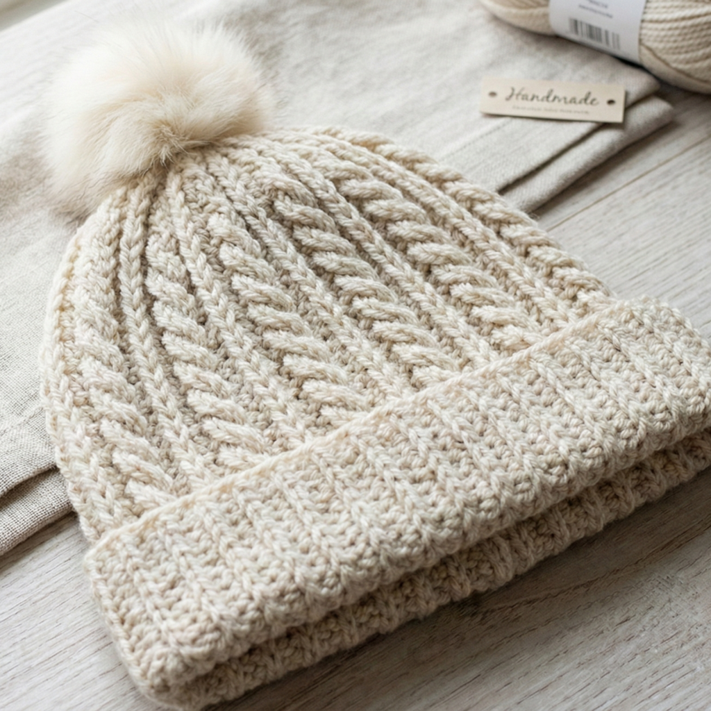 Vibe: textured rib / mock cable look — a refined, cozy beanie.