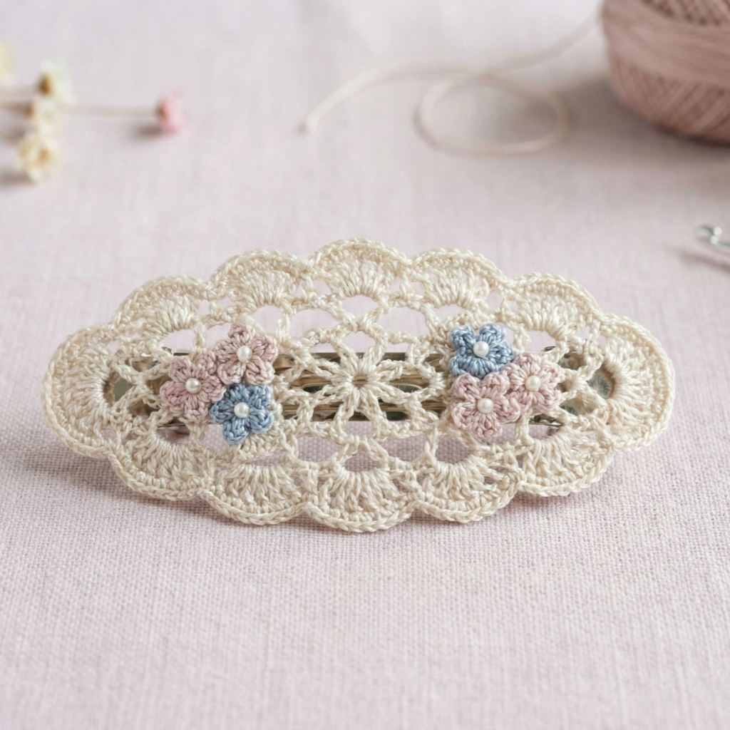 A delicate oval motif made in thread or fine yarn that sits on a barrette — airy and elegant.
