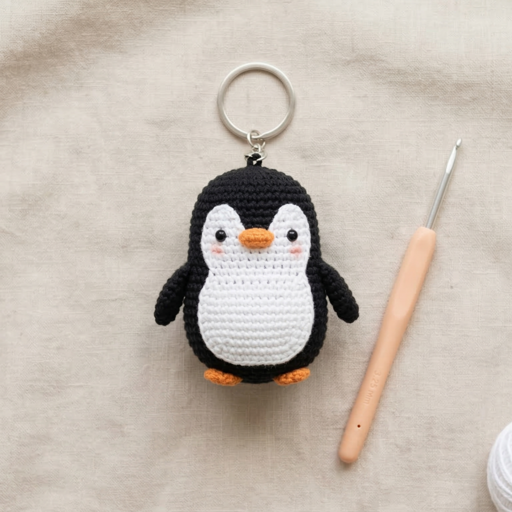 - Use a strong sewn yarn loop at top or crochet a short chain loop (ch6) and whipstitch both ends into top of penguin head — then attach jump ring.