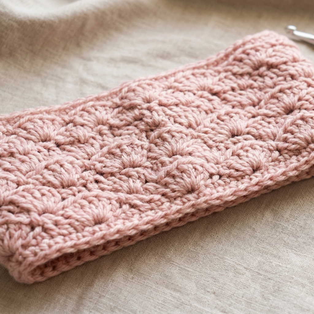 Double shell = sets of shells staggered across rows for a textured, feminine headband. Works up quickly and looks detailed without complex stitchwork.