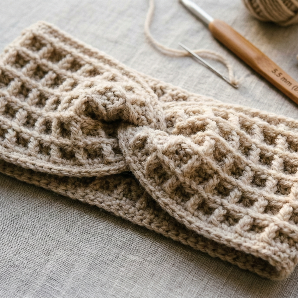 - Make a wider waffle headband by increasing foundation chain and working more rows.