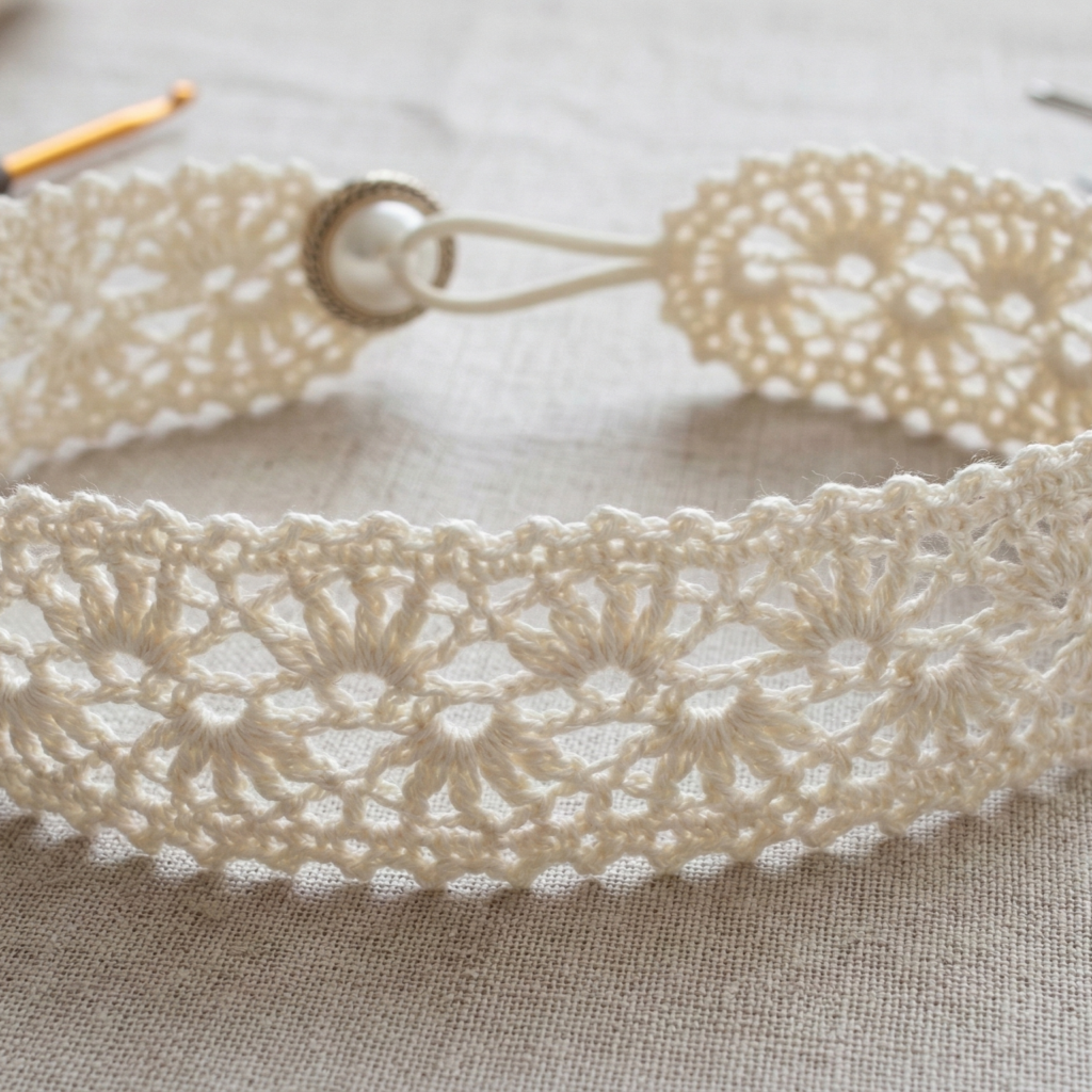A narrow, airy band using a small shell and chain-lace repeat. Work in rows, join ends, and add a decorative closure (button + loop) so the lace pattern remains unbroken.